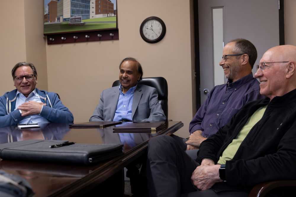 UWL faculty and administration efforts combined to help UWL grow undergraduate research across campus in the 1990s. Some of those faculty and staff are still serving UWL today. From left, Aaron Monte, chemistry professor; Gubbi Sudhakaran, interim dean of the College of Science & Health; Scott Cooper, biology professor and Ron Rada, former longtime faculty member and administrator.