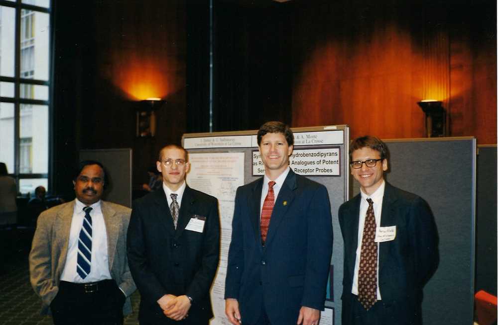 From left, UWL Professor Gubbi Sudhakaran, UWL student researcher Mike Whiteside, former U.S. Congressman Ron Kind, and UWL Professor Aaron Monte at a “Posters on the Hill” event in the late 1990s.