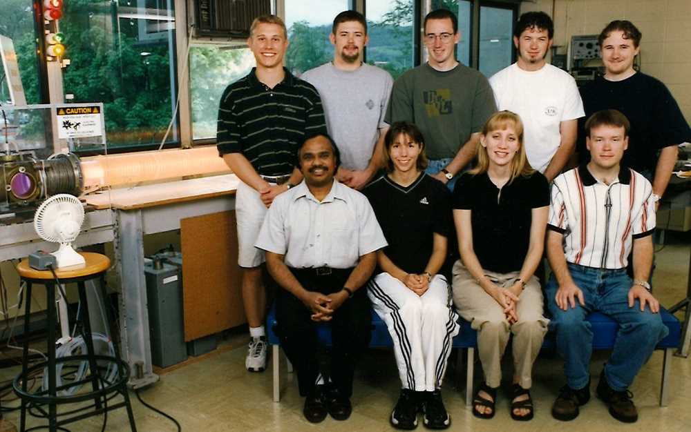 Gubbi Sudhakaran, front row, far left, pictured with undergraduate research students in the laser lab in 1999. Sudhakaran set up the university’s first experimental research lab in the Physics Department for students to engage directly in physics research.