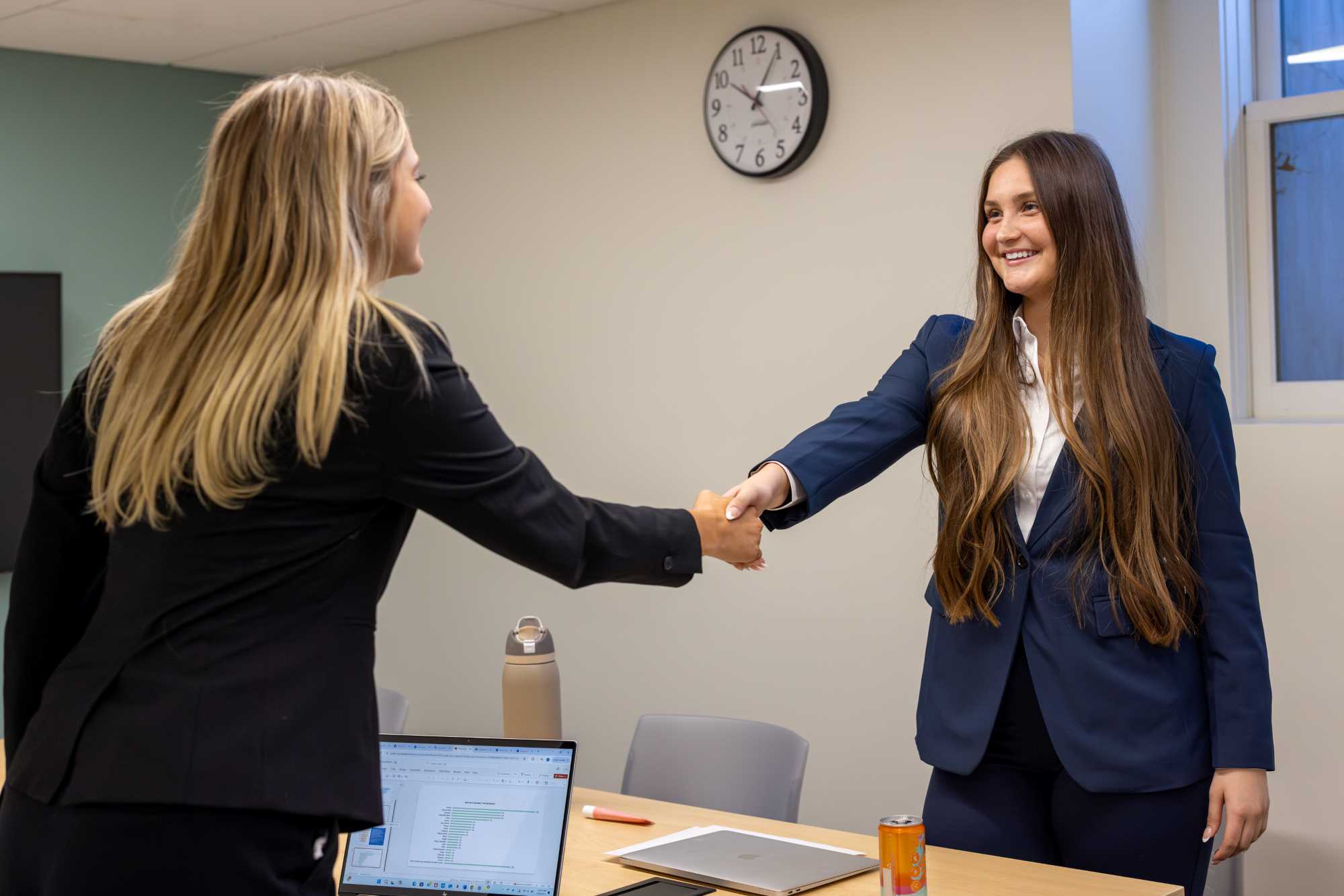 A handshake before the interview. The College of Business Administration's Eagles Sales Competition allowed students to put their communication and marketing skills to the test.