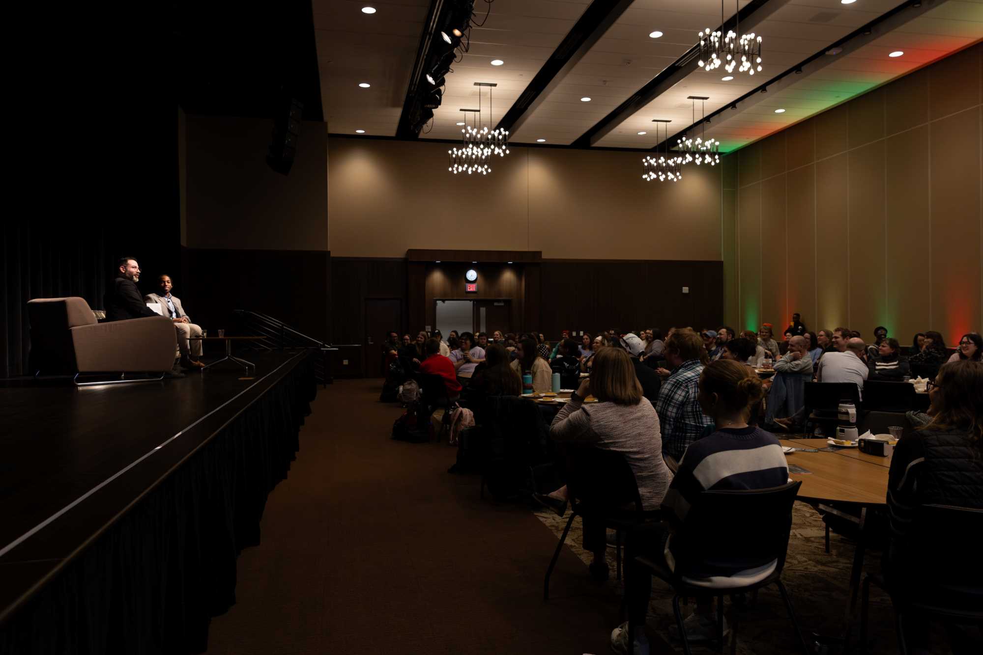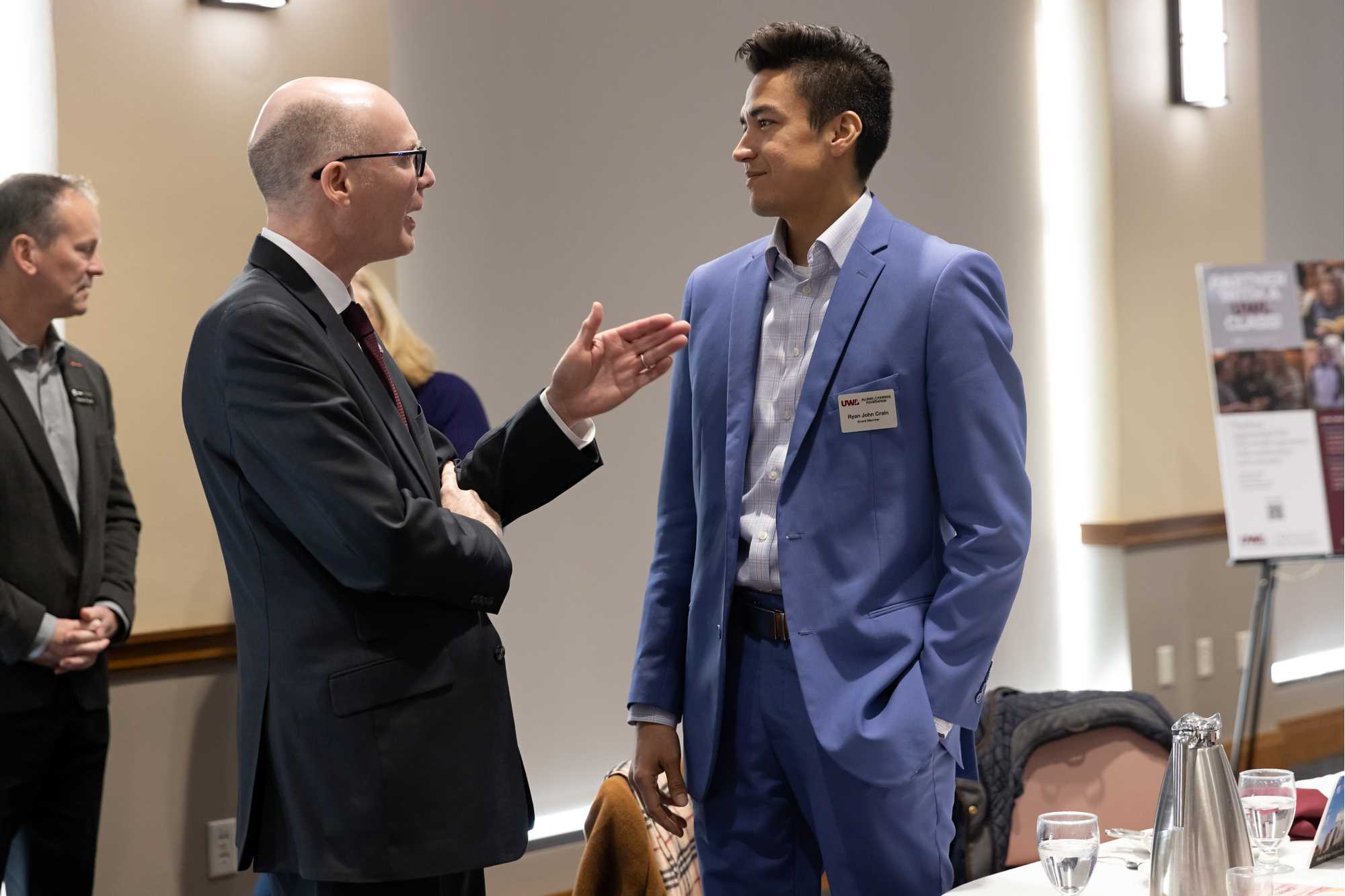 Chancellor James Beeby chats with Ryan John Crain, executive director of education for the Ho-Chunk Nation, at the Chancellor's Community Forum at UWL.