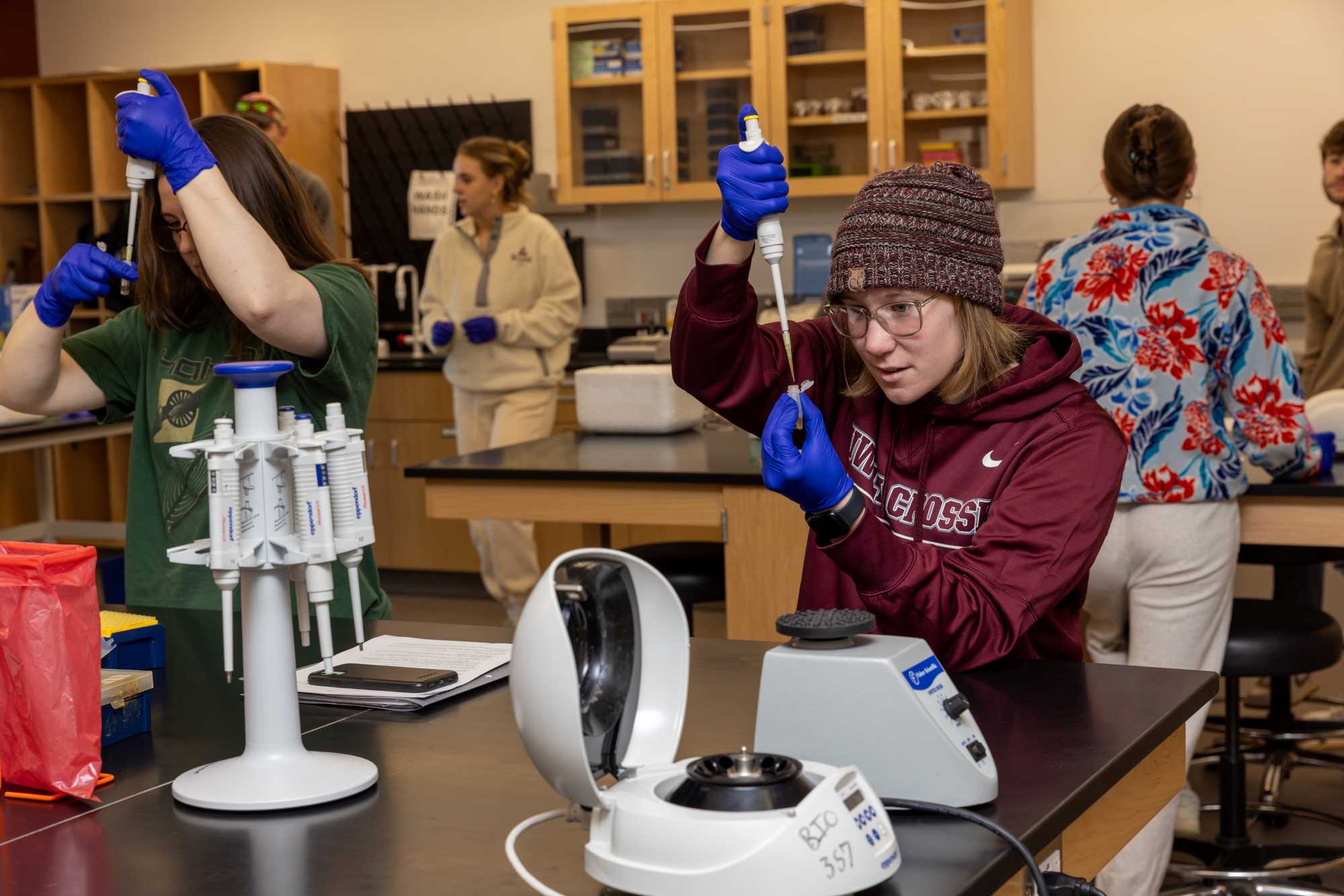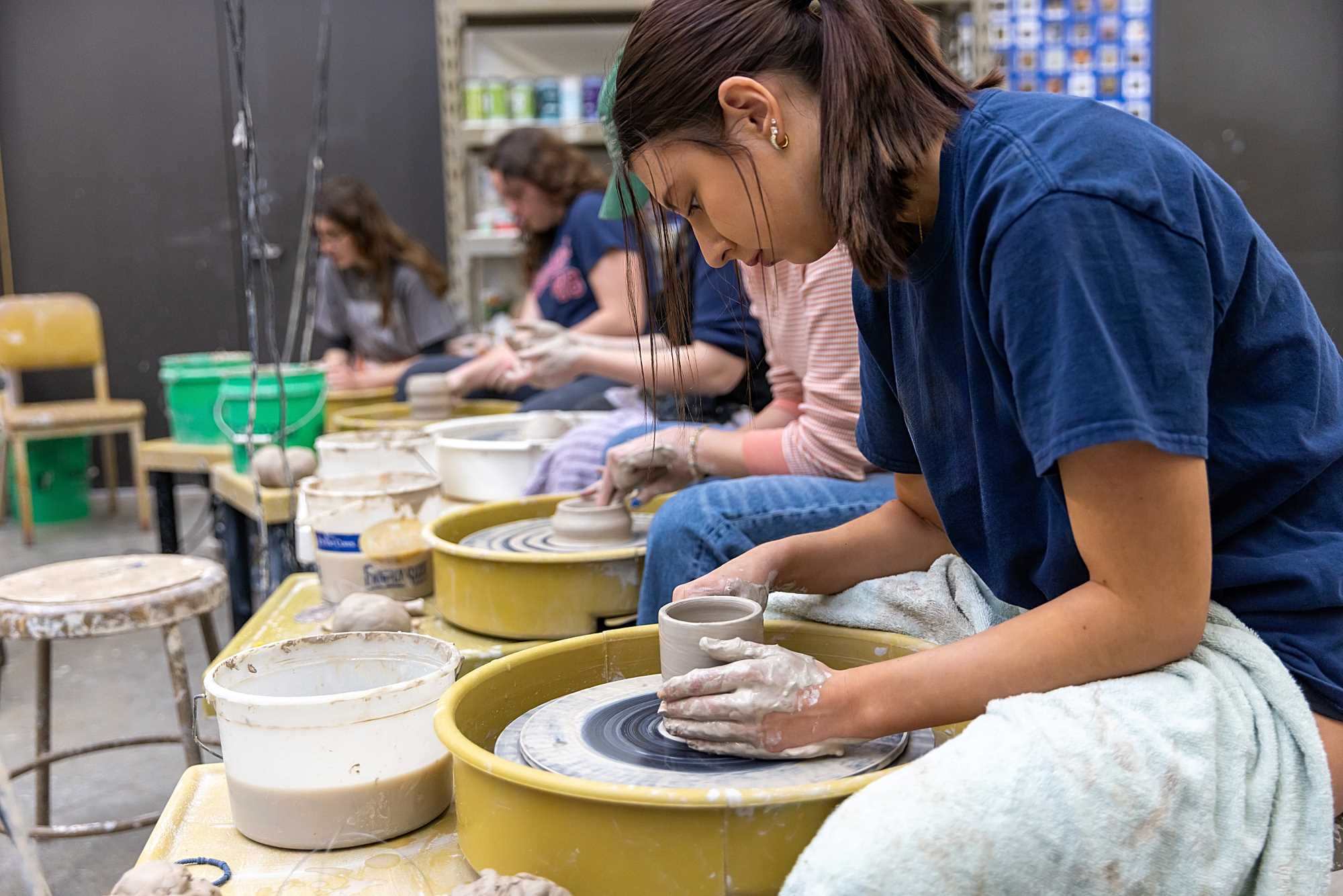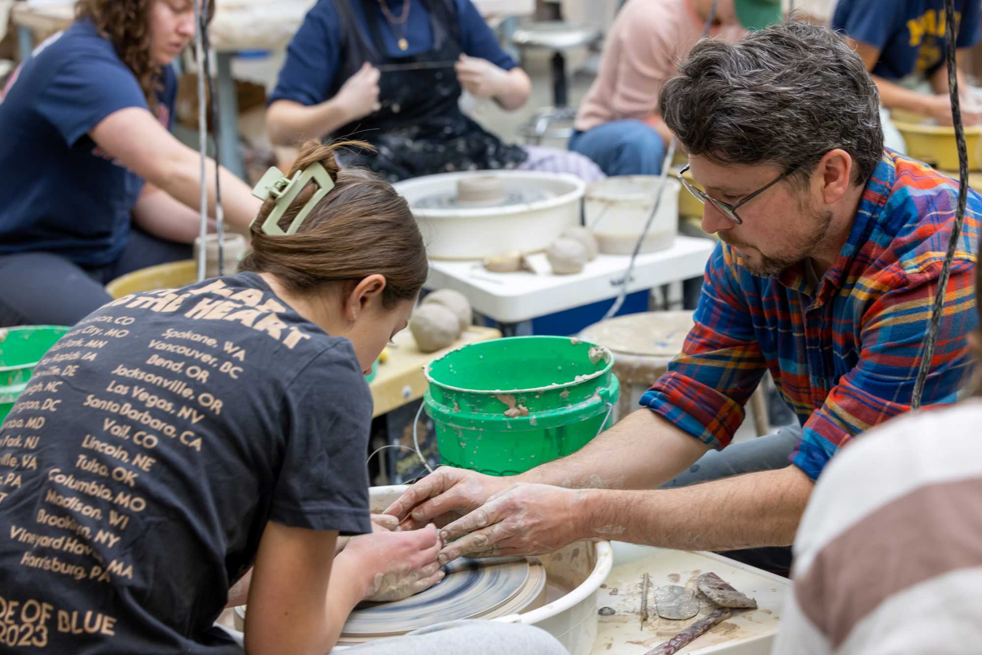Jarred Pfeiffer, associate professor of art, offers a helping hand in his Introduction to Ceramics course.