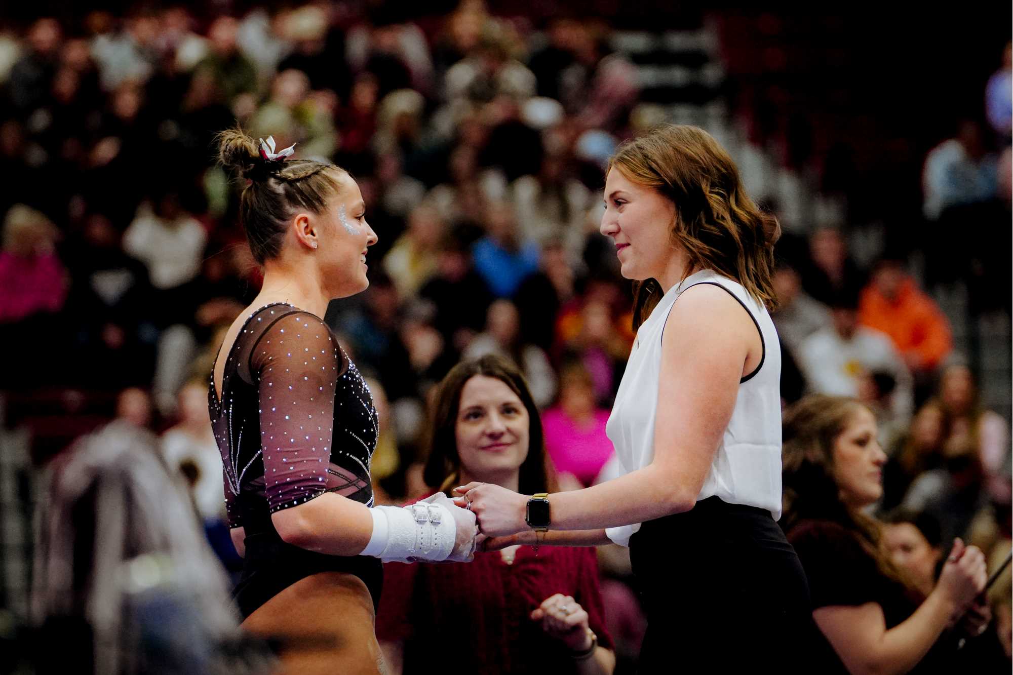 Gymnast Madalyn McCormick and Coach Lexi Wills bump fists in celebration