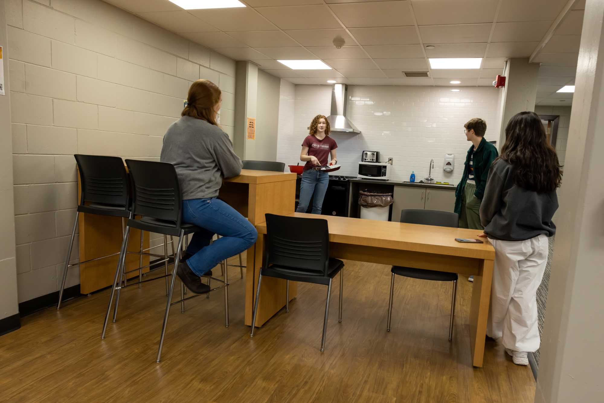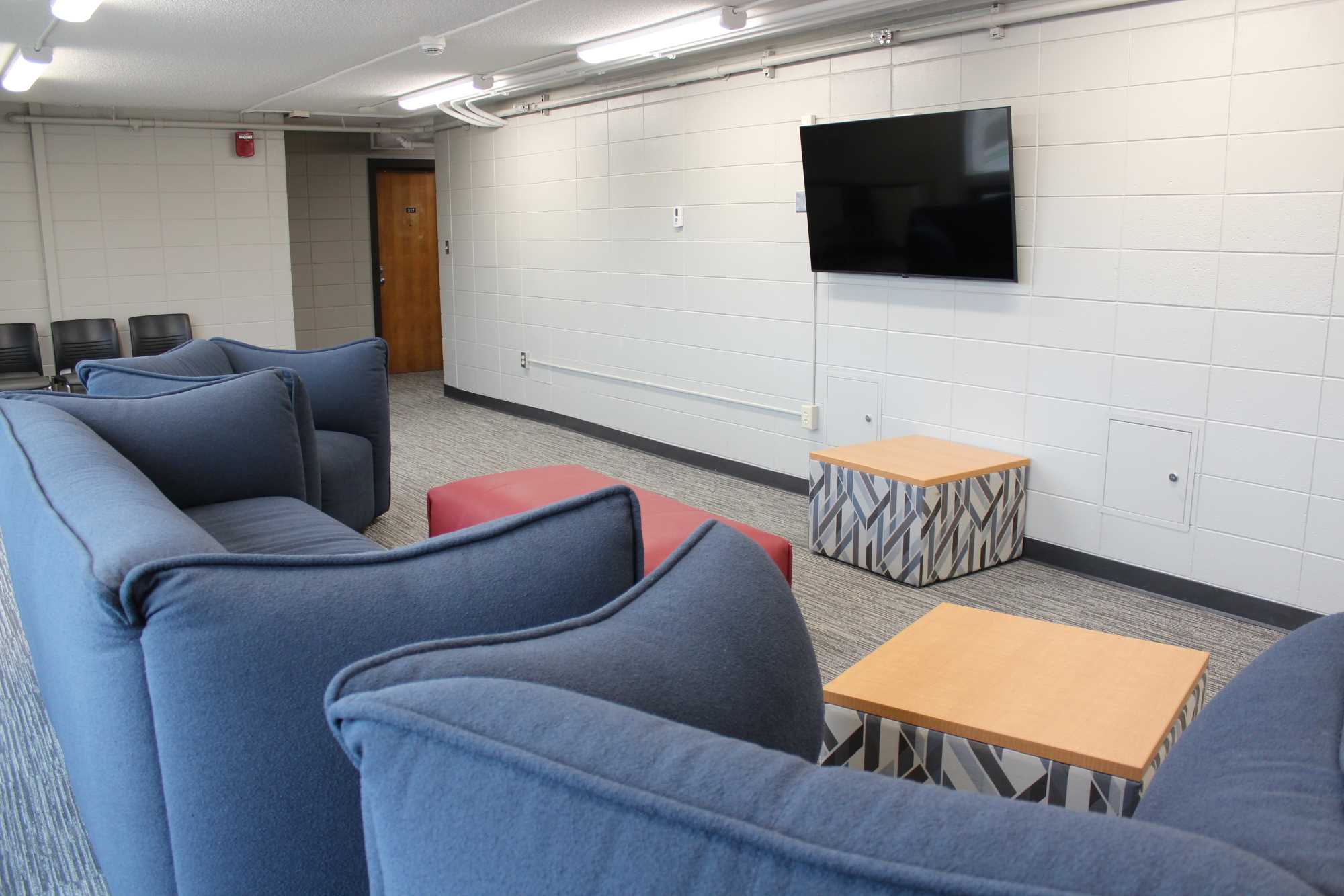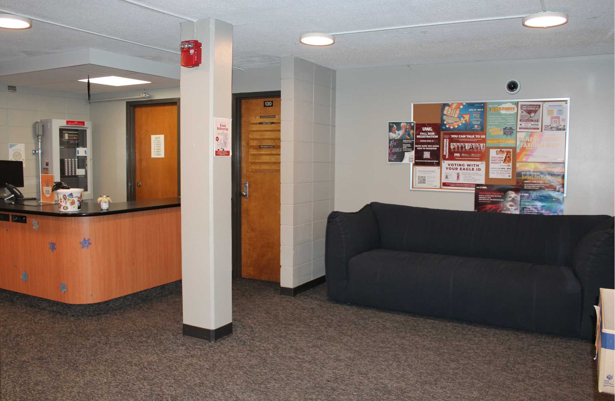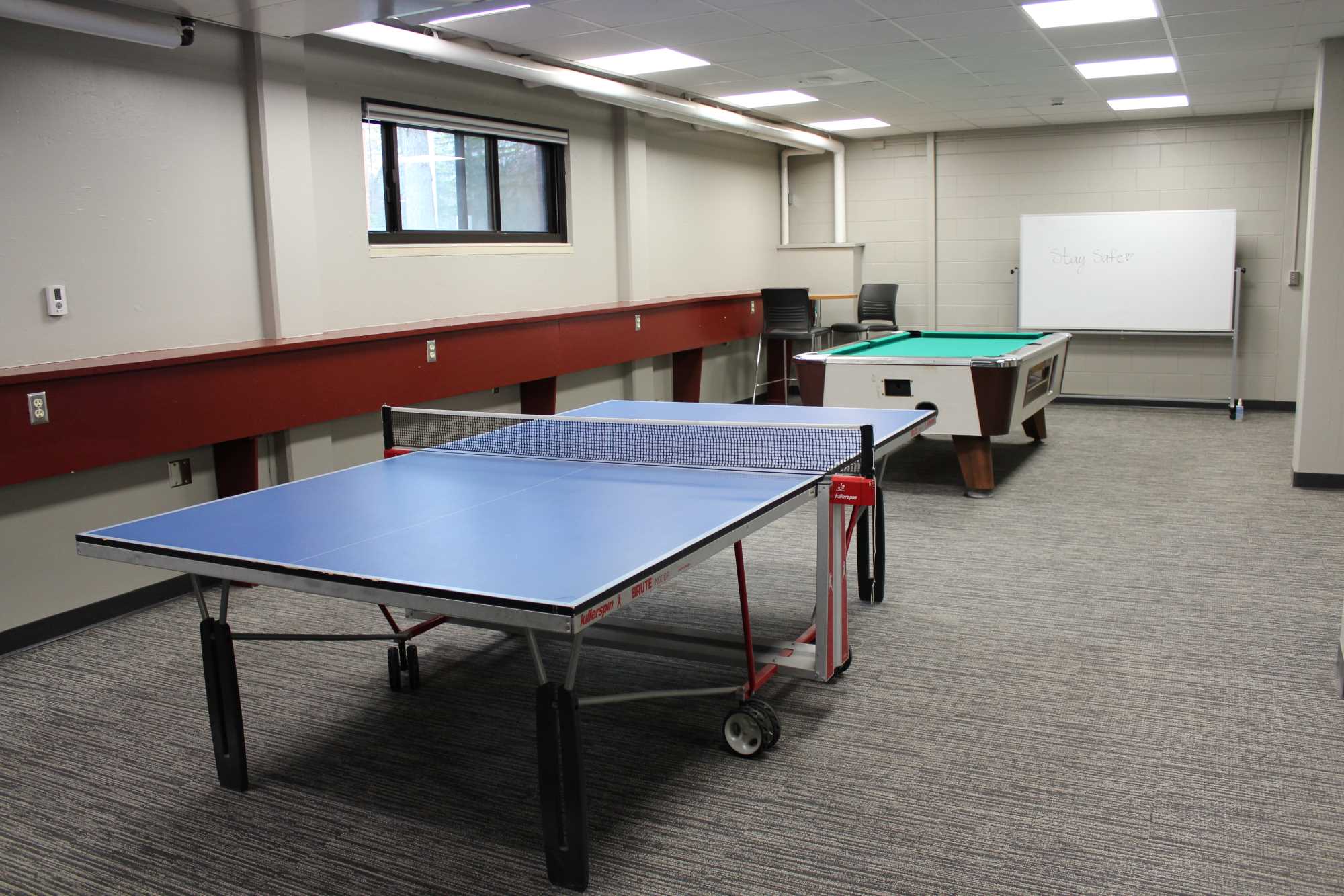 Laux Hall is a wing-style hall with 210 residents, primarily first year students. It is located on the northeast side of campus. The students on the floors are mixed by gender but not within the same room. There is a lounge on each floor. The kitchen, study areas, pool table and TV area are in the basement. Laux Hall bathrooms have been renovated and there is an all-gender bathroom on each floor. The rooms have updated furniture, paint, carpet, and lighting.