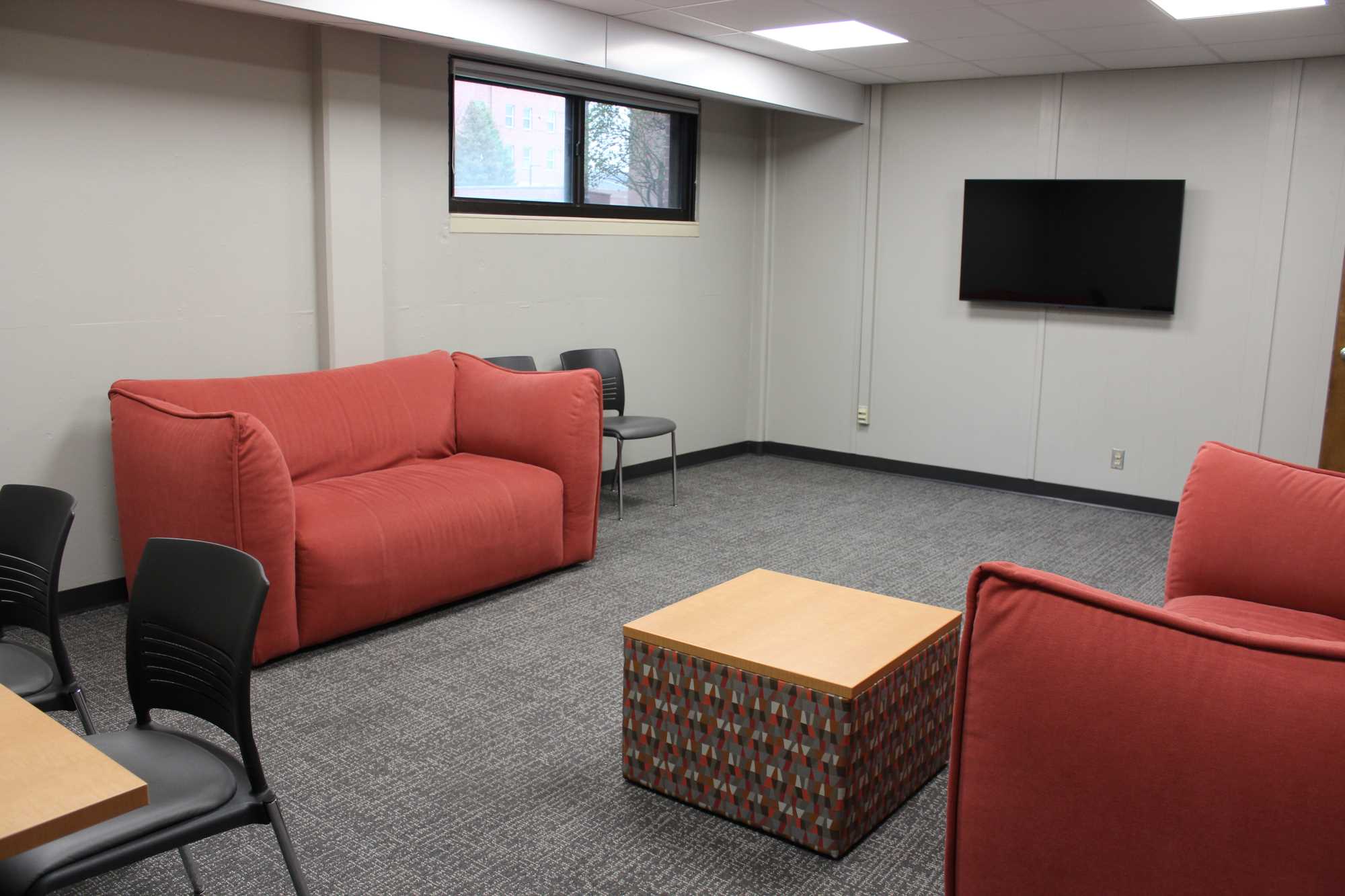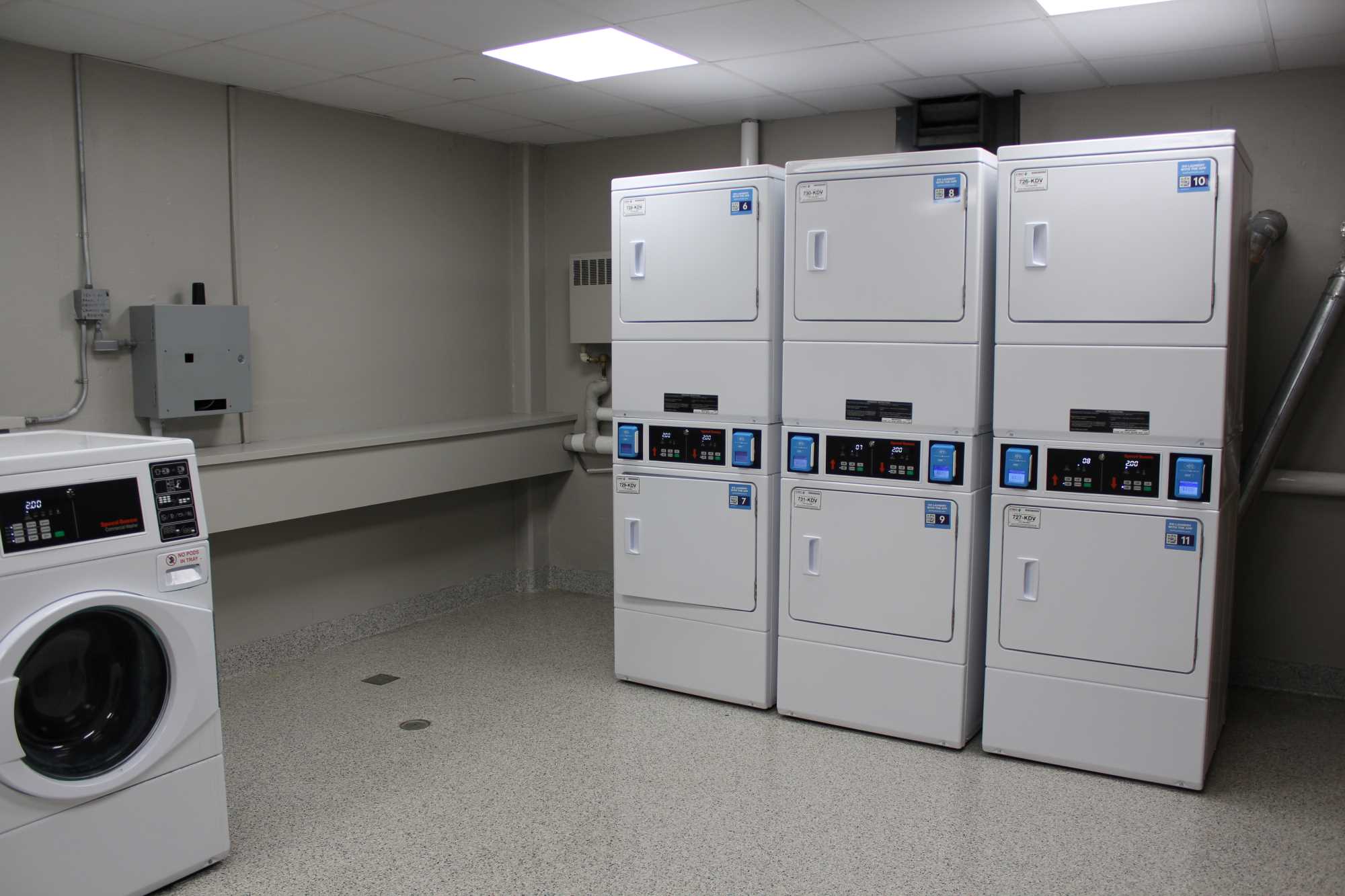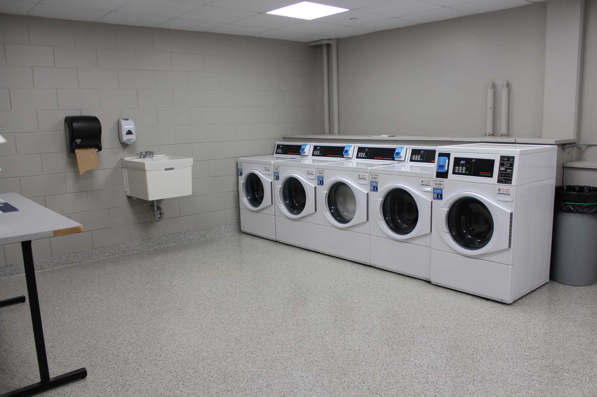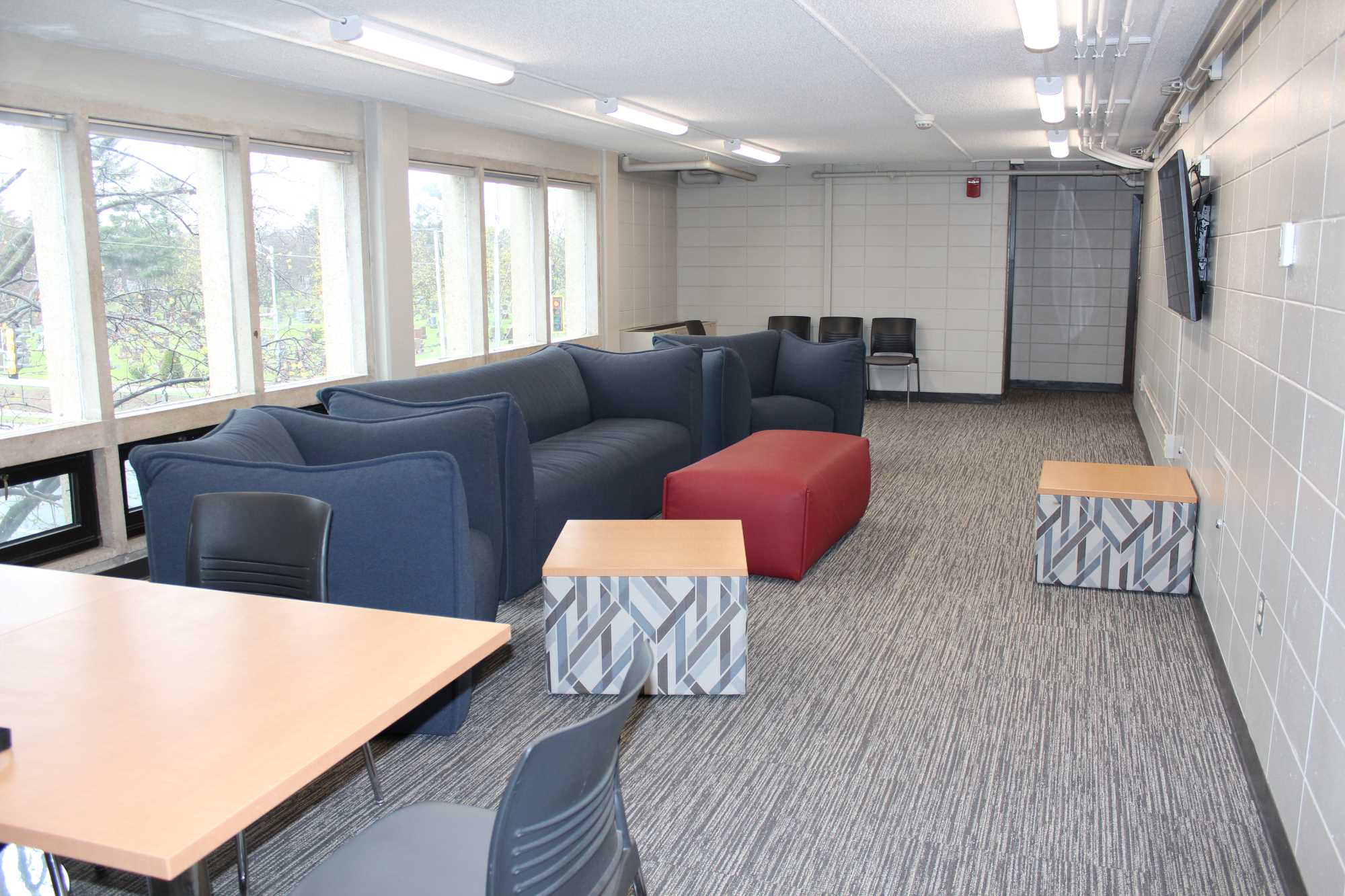 Laux Hall is a wing-style hall with 210 residents, primarily first year students. It is located on the northeast side of campus. The students on the floors are mixed by gender but not within the same room. There is a lounge on each floor. The kitchen, study areas, pool table and TV area are in the basement. Laux Hall bathrooms have been renovated and there is an all-gender bathroom on each floor. The rooms have updated furniture, paint, carpet, and lighting.