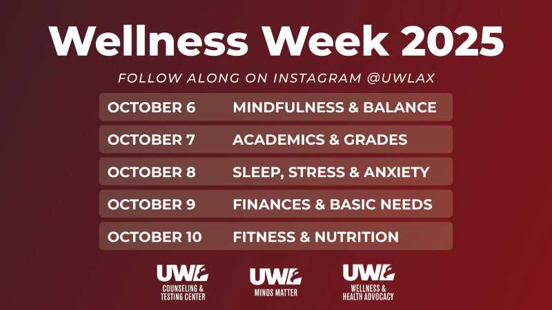 Wellness Week, October 6-10, 2025, is the perfect opportunity to dedicate a little extra time to your health and well-being. Follow the social media campaign on Instagram to learn about resources and opportunities to participate (@uwlax, @uwlpeerhealth, and @uwlctc).