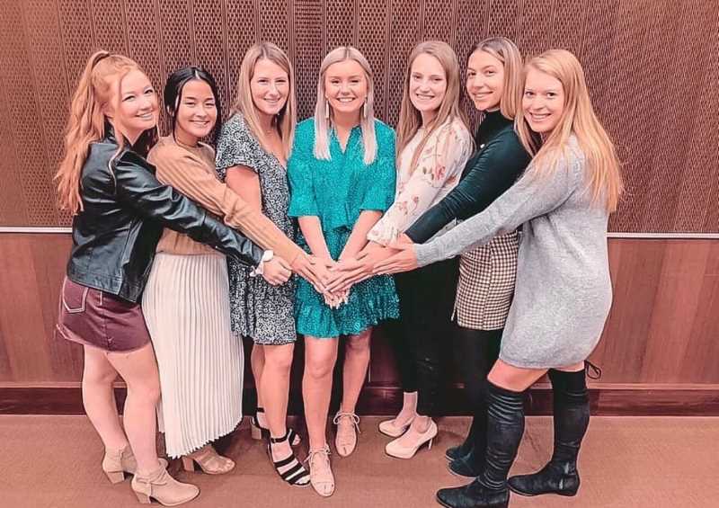 A group of sorority women come together for a photo after an Alpha Phi meeting.