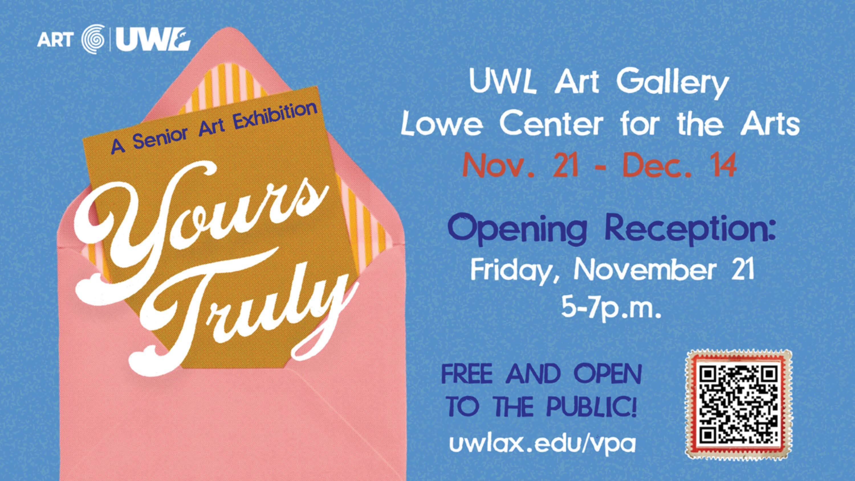 At the close of each semester, our graduating art majors present their capstone exhibition in the UWL Art Gallery. Join us for Yours Truly: a senior art major exhibition, with a public opening reception at 5 p.m. on November 21 in the UWL Art Gallery. On display through December 14.